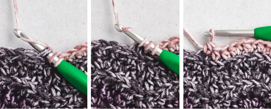 Yarn over again and pull the yarn through the first 2 loops. (You’ll be left with 3 loops on the hook)