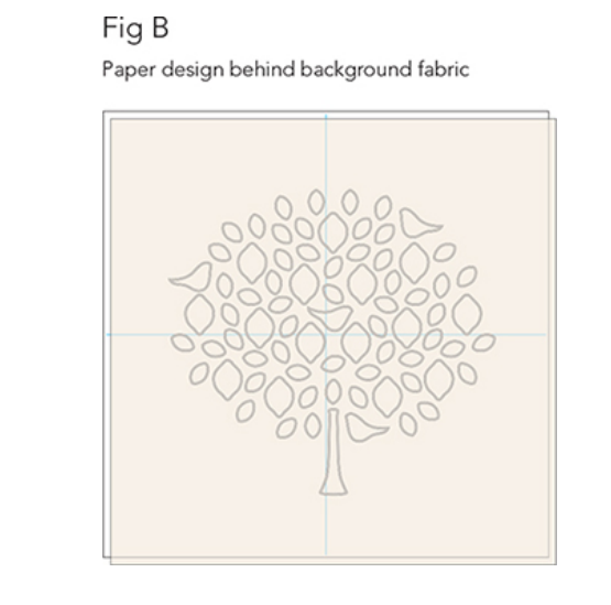 Position the appliqués on the background fabric as indicated in Figure E, using the paper design beneath for proper placement. Use a bit of glue, pins, or basting stitches to secure the shapes in place. After positioning, sew the appliqués to the fabric with tiny stitches around the edges, matching the thread color to the fabric. Carefully remove the paper shapes after sewing. Cut through the fabric only behind each appliqué from the back of the background fabric and coax out the paper. Press the work. Smooth out any uneven edges on the back by fixing them to the middle of the appliqué with a small amount of glue if necessary.
